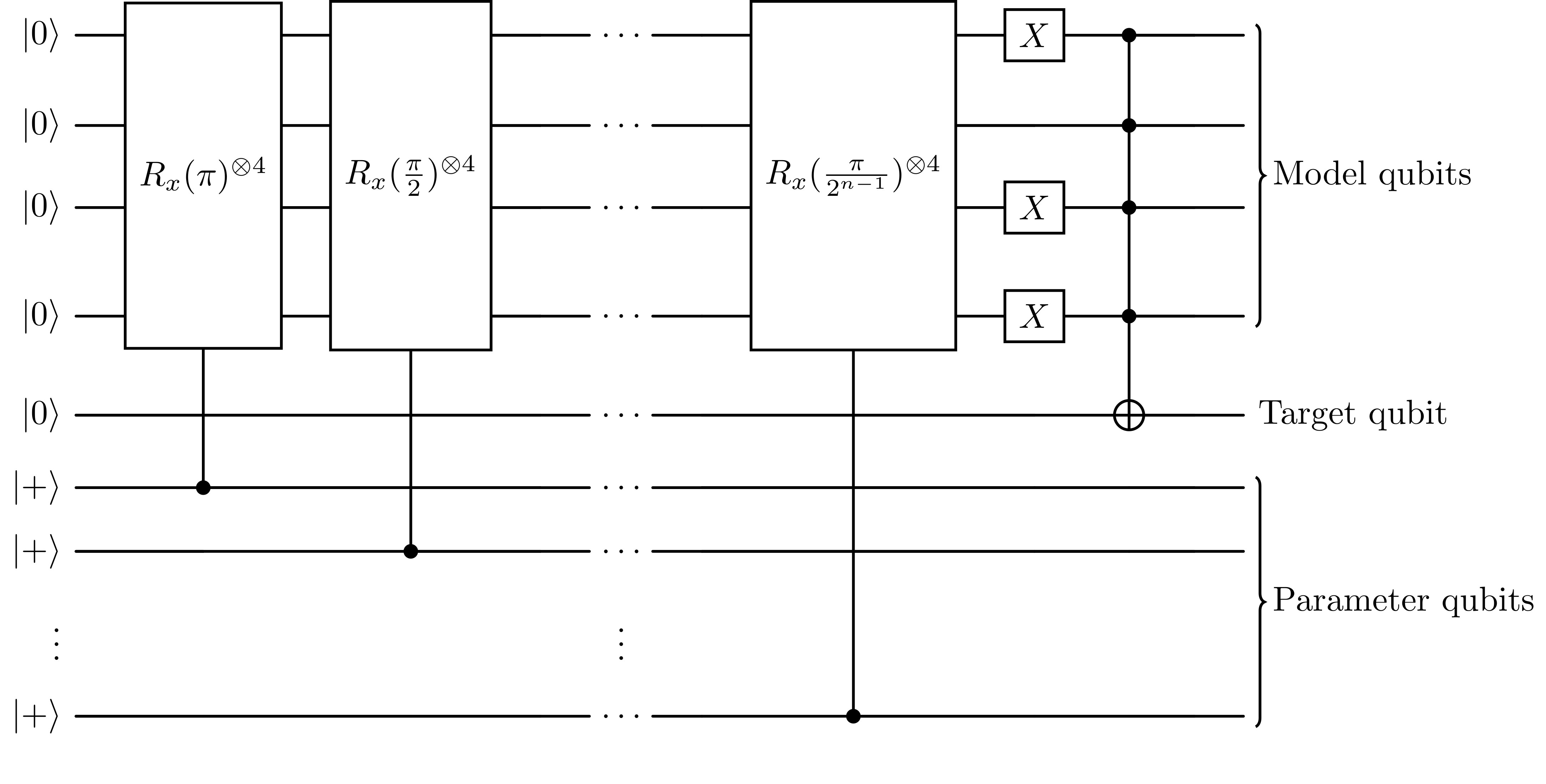 In this circuit we introduce 4 model qubits, where each qubit models the generation of one sample. As you can see, we model the Bernoulli distribution as a single qubit that is simply rotated around the X axis. We want to achieve that the models correctly represent the true distribution, which we do by introducing the target qubit. Additionally, we introduce parameter qubits, initially in the $|+\rangle^4$ state, where the amplitude of the correct parameter configuration is to be amplified. Intuitively, we want to find the most likely parameter configuration that generates the examples. We do this by amplifying those amplitudes, that correspond to the most likely parameter configuration. It is important to note that the AA subroutine only goes over the target and parameter qubits and NOT over the model qubits. This effectively allows us to use up to 40 or so parameter qubits realistically, before the runtime of AA explodes irresponsively, when usinig a fault-tolerant quantum computer. For classical simulations, we are bounded to about 20-30 parameter qubits or so (depending on if you have access to a super-computer).